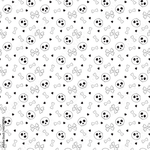 Halloween cute skulls, bones and hearts seamless pattern. Hand drawn vector isolated illustration. Ideal for background, print, design on paper or fabric.