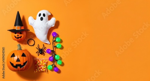 halloween, decoration, candy, orange, pumpkin, ghost, spider, light, holiday, skittish, autumn, october, trick, treat, celebration, festive, season, party, event, traditional, sweet, colourful, bright, fun, cute, still, life, arrangement, tabletop, overhead, view, studio, shot, nobody, object, symbol, icon, card, invitation, banner, poster, surface