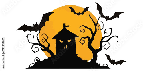 moon, scarey, holiday, dark, cartoon, black, cat, october, party, design, celebration, orange, illustration, silhouette, vector, tree, pumpkin, halloween, night, autumn, skittish, horror, house, ghost