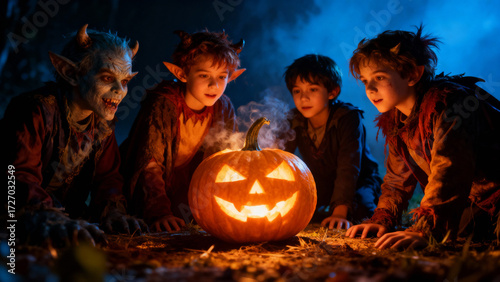 halloween, pumpkin, costume, children, night, skittish, glowing, group, boy, girl, face paint, horn, devil, fantasy, magic, dark, forest, eerie, scarey, creepy, celebration, trick or treat, party, fun, friends, gathering, light, smoke, glow, orange, carved, smiling, happy, excited, play, together, costume, monster, creature, spirit, autumn, fall, holiday, seasonal, festive, event, tradition