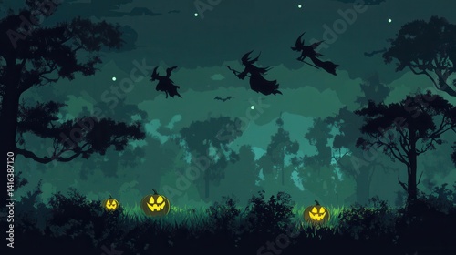 Halloween night scene with witches flying over a forest with glowing pumpkins. Spooky Halloween concept.