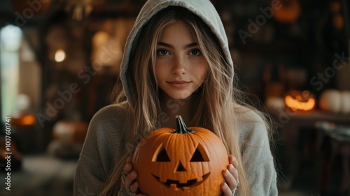 Halloween Night with Hooded Girl Holding Glowing Jack-O-Lantern