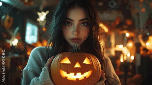 Halloween Night with Hooded Girl Holding Glowing Jack-O-Lantern