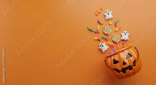 Halloween pumpkin bucket overflowing with candy, including lollipops and ghost-shaped treats, against an orange background.