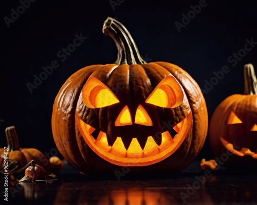 Halloween pumpkin smile and scary eyes for party night. Close up view of scary Halloween pumpkin with eyes glowing inside at black background. Selective focus