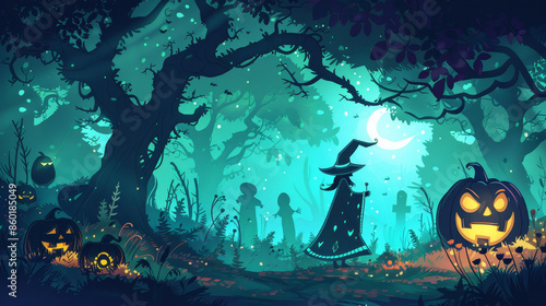 Halloween scary illustration background with witch in hat in the forest and bats in green blue colors with orange pumpkins