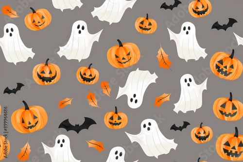 Halloween seamless pattern: cut out evil pumpkins, ghosts, bats on a gray background. Wrapping paper.