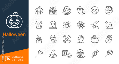 halloween, skittish, horror, pumpkin, ghost, vampire, skull, skeleton, sorcerer, bat, spider, web, haunted, house, zombie, grave, coffin, frankenstein, moon, owl, cat, candle, cauldron, potion, candy, lollipop, october, fear, costume, calendar, bone, monster, creepy, icon, line, illustration, vector, editable, stroke, set, symbol, outline