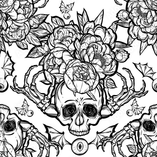Halloween. Vector illustration. Skull, bones, peonies. Handmade, prints on T-shirts, background white, tattoos. seamless pattern