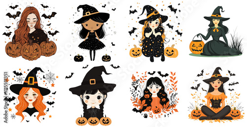 Halloween Witch Illustrations Set with Pumpkins and Clear Background - Perfect for Overlay and Design