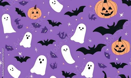 Halloween-themed seamless pattern featuring bats, pumpkins, and ghosts