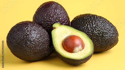 Halved and whole vertical avocados displayed on a vibrant yellow background in even lighting