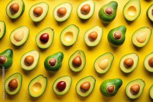 Halved Avocados on Bright Yellow Background with Copy Space for Banner, Ideal for Healthy Eating, Cooking, Nutrition, or Food Blog Promotions