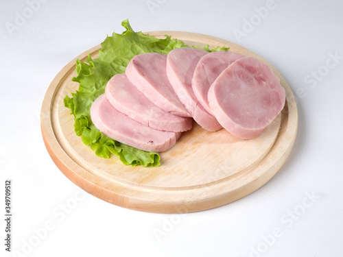 Ham sliced on a blackboard. Next to a leaf of lettuce