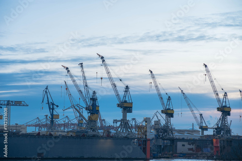Hamburg, Germany. River station of the city against the backdrop of the river Elbe and port cargo grains