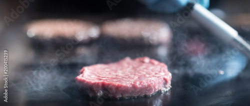 Hamburger cutlet frying on pan.Natural meet loaf pieces cooking in the kitchen.Burger sandwich meat being cooked with a lot of white smoke from a fat and oil.