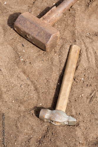 old, material, construction, tool, equipment, industrial, object, set, instrument, closeup, closeup, build, fix, repair, work, hammer, kick, sledgehammer, maul, sand, outdoors, outside