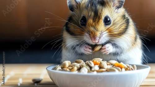 Hamster enjoying a bowl of seeds, close-up on a wooden surface.