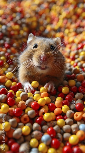 hamster, rodent, pet, animal, cute, small, happy, food, colourful, treat, healthy, petfood, feeding, nourishment, adorable, small animal, mammal, wildlife, closeup, portrait, bright, high-coloured, many-coloured, dietary, grain, pellet, chew, munch, playful, entertainment, home, warm, fuzzy, cage, fun