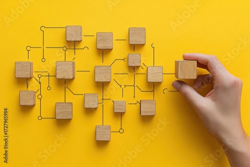 hand, wooden blocks, block, yellow background, flowchart, organisation, planning, strategy, process, diagram, logic, connection, structure, concept, business, management, system, workflow, symbol, network, arranging, layout, visualisation, problem solving, design, hand gesture, coordination, conceptual, teamwork, illustration, idea, chart, organization chart, workspace, office, collaboration, abstract