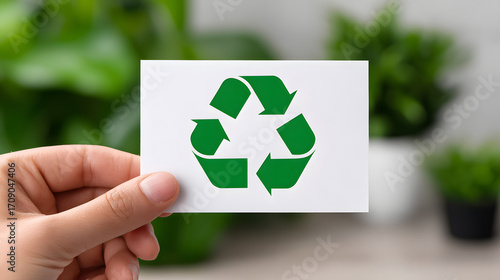 Hand card recycle symbol green paper eco sustainability environment sign close up hand holds white card with green recycle symbol, clean and minimal style, encouraging eco habit and sustainability