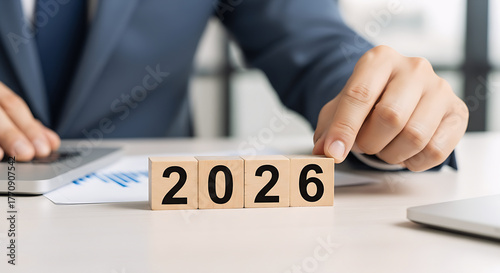 Hand Changing Wooden Blocks to Display the Year 2026 for Business Planning.