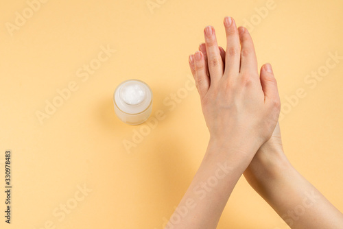 Hand cream and woman hands on a beige background.