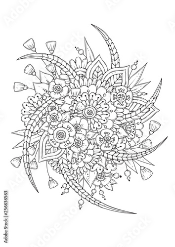 Hand drawn backdrop. Coloring book, page for adult and older children. Black and white abstract floral pattern. Vector illustration. Design for meditation.