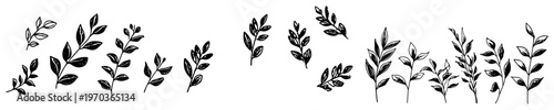 leaf, tree branch, botanical, floral, foliage, nature, plant, garden, hand-drawn, vignetting, collection, set, element, organic, laurel, herb, greenery, spring, summer, minimalist, decorative, design, vector, clip art, eco, ecology, forest, wild, black, white