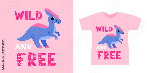 Hand drawn cartoon parasaurolophus. Cute dino with the phrase wild and free. Print for a t shirt with mock up.