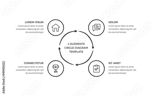Hand drawn circle diagram template with 4 elements, doodle infographics, vector eps10 illustration