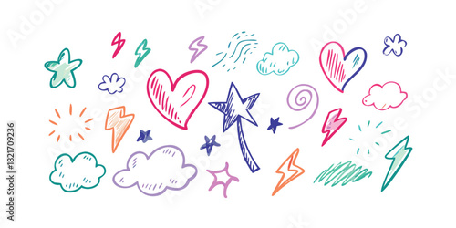 hand-drawn, doodle, vector, set, wax crayons, pastel, tone, isolated, cut-out, heart, star, cloud, swirl, scribble, graphic, design element, colourful, playful, whimsical, simple, cute, abstract, shape, icon, drawing, vignetting, chalk, texture