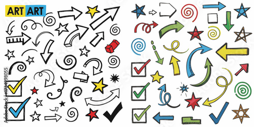 doodle, hand-drawn, vignetting, arrow, star, spiral, checkmark, symbol, shape, icon, graphic, design, element, collection, set, outline, coloured, black, white, concept, direction, swirl, line, curve, pointer, mark, tick, success, option, choice, drawing, illustration, textured, pattern, abstract, signs, progress, creativity, education, infographic, highlight, simple, playful, artistic, geometric, whimsical, fun, grunge, scroll