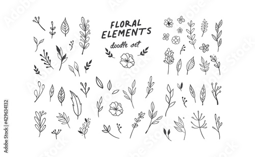 Hand drawn floral elements. Swirls, laurels, arrows, leaves, flowers and branches. Doodle botanical elements.