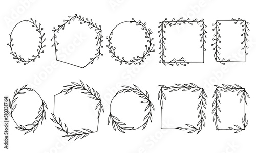 Hand drawn floral frames in different shapes collection, isolated borders with leaves ornament in outline style vector illustration.
