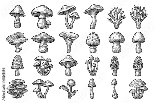 Hand drawn forest mushrooms and fungi collection in vintage engraving style, Transparent Background