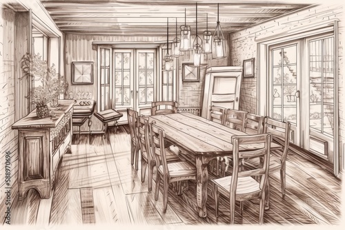 Hand drawn handmade farmhouse dining room with table, chairs, and parquet mezzanine. Custom unfinished architectural interior design,. Generative AI