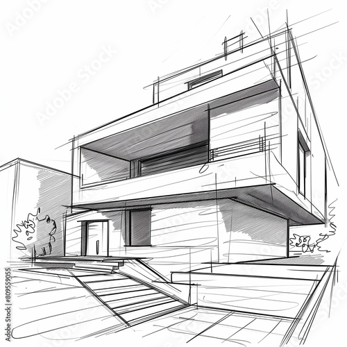 Hand drawn linear building housse sketch using pen. Architectural sketch idea drawing. Generative AI
