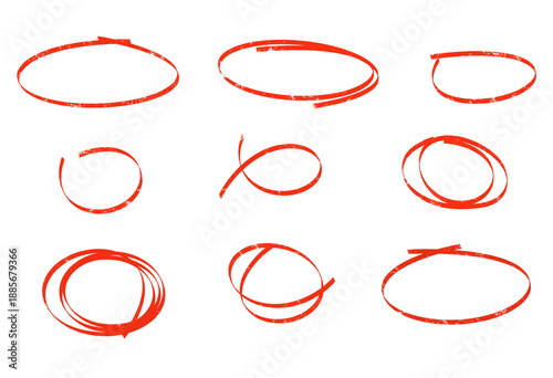 Hand drawn red circles in various styles on white background with bold lines and dynamic shapes for graphic design
