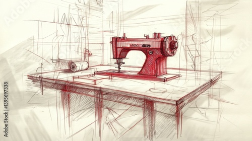 Hand Drawn Red Sewing Machine Sketch on Table Craft Needlework Equipment