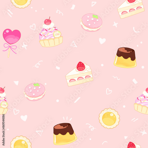 Hand drawn seamless pattern with cakes and sweets on pink background, white doodle