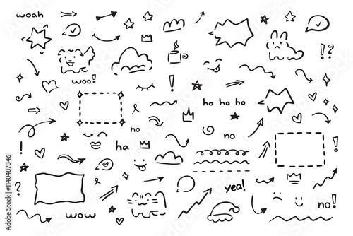 doodle, set, element, icon, simple, line art, hand-drawn, speech bubble, arrow, star, nubes, vignetting, symbol, logotype, stroke, underline, collection, print, scribble, decoration, drawing, black, white, sticker, childish, curve, line, cute, vector, graphic, background, crown, element, marker, pen, wax crayons, signs, border, brush, isolated, design, decoration, ink, shape, icon, cat, rabbit