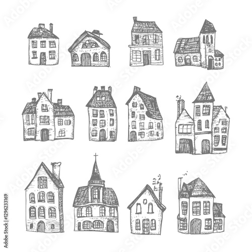 Hand Drawn Sketches Of Various Houses With Detailed Facades