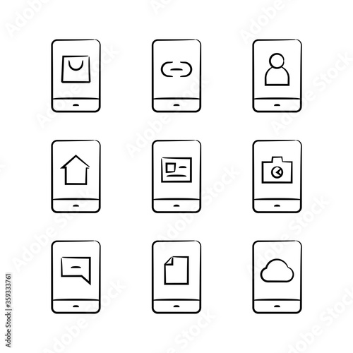mobile, phone, call, communication, hand-drawn, line, chain, link, user, profile, home, homepages, screen, contraption, chat, message, paper, document, cloud, server, hosting, camera, vector, signs, symbol, illustration, tech, web
