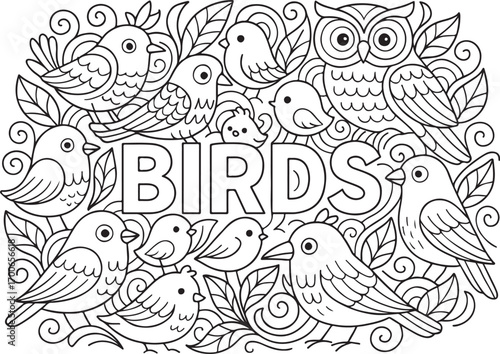 hand drawn vector doodle illustration of Bird Family coloring page for kids line art
