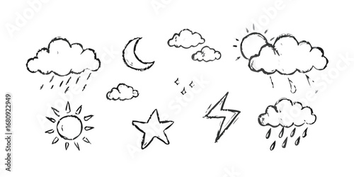 weather, sun, cloud, rain, moon, star, lightning, storm, drawing, vignetting, illustration, symbol, nature, sky, forecast, climate, element, graphic, design, simple, cute, doodle, hand-drawn