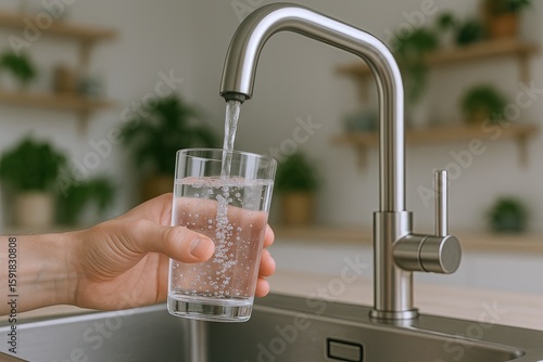 Hand filling clear glass with sparkling water from modern kitchen faucet with greenery.