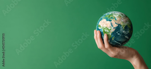 Hand gently holds small globe against vibrant green background, symbolizing environmental care and global responsibility