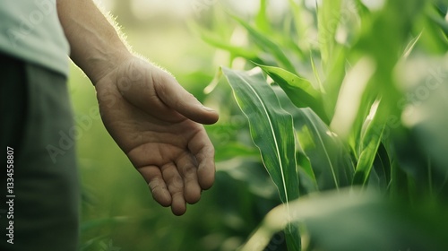 Hand gently touching green leaves, close-up of a hand in a lush garden, symbolizes connection to nature and growth.