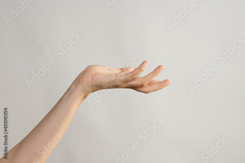 hand, hold, giving, up, take, arm, holding, care, support, hand, gesture, palm, part, symbol, showing, skin, wrist, body, space, caucasian, isolated, signs, empty, gesture, white, female, human, finger, people, grey background, copy space
